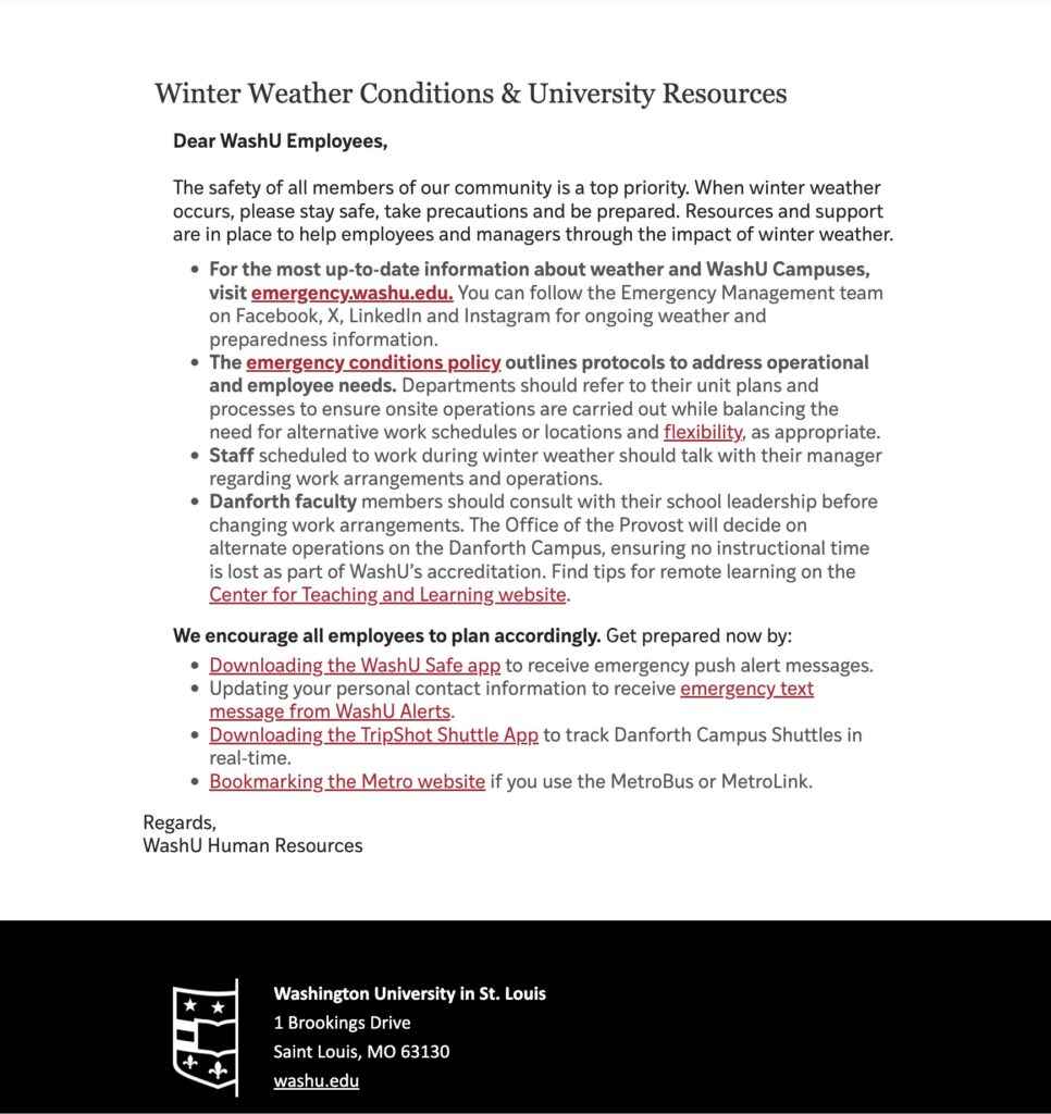 When winter weather impacts our region, safety and preparedness are our top priorities. Washington University offers several resources to help employees and managers plan ahead, stay informed, and adjust operations as needed.